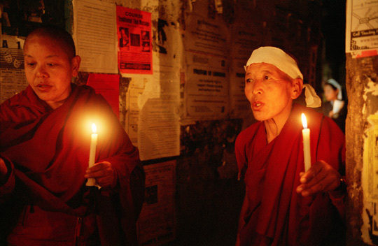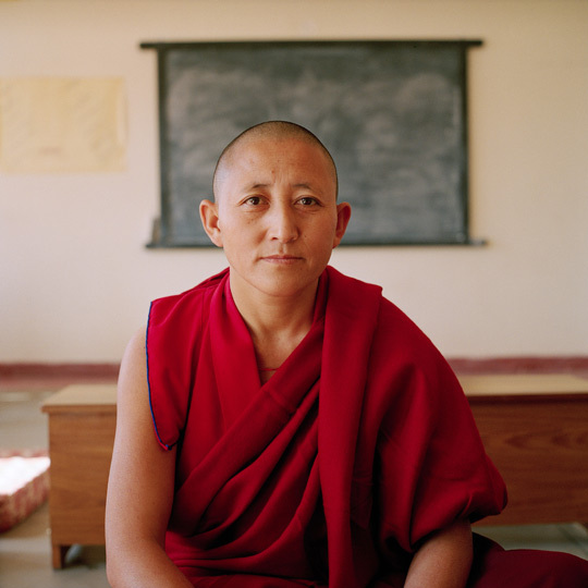 Le Dalaï-lama, qui enseignera cet été à Toulouse, n'est plus à présenter. Par contre, on parle rarement des nonnes tibétaines, pourtant très impliquées dans la "résistance tibétaine". Elles se nomment Tenzin, Nyama, Dechen, Rigzin ou Dolma. Les plus jeunes sont nées en exil en Inde ou au Népal, les autres ont traversé l'Himalaya, parfois au risque de leur vie pour fuir l'occupation chinoise, afin de vivre leur liberté religieuse. Toutes portent la robe des moniales, certaines ont passé de longues années dans les prisons et les camps de travail chinois. On estime que près de la moitié des manifestations au Tibet ces dernières décennies ont été conduites par des nonnes. Ce travail, lancé en 2008, a été réalisé dans quatre couvents de nonnes situés près de Dharamsala, siège du gouvernement tibétain en exil et lieu de résidence du Dalaï-lama. Ces couvents font partie du "Tibetan Nun's Project", présidé par Rinchen Khando Choehyal. Mariée au plus jeune frère du Dalaï-lama, elle a été ministre de l'éducation et la première présidente de l'association des femmes tibétaines. Elle a désormais choisi de dédier sa vie à l'éducation et à l'amélioration des conditions de vie des nonnes en exil. "Joyau de Sagesse (le Dalaï-lama) Mon pays a été volé. Que nous, les amies en esprit, prisonnières, qu'importe que l'on nous batte cruellement. Nos bras joints ne peuvent être séparés." Extrait d'une chanson composée en prison par les 14 de Drapchi, 14 nonnes arrêtées entre 1989 et 1992 à Lhassa, pour avoir participé à des manifestations paisibles, de très courte durée, en faveur de l'indépendance du Tibet. Condamnée initialement à neuf ans de prison, Phuntsok Nyidron s'est vue infliger huit années supplémentaires de détention pour avoir enregistré des chants demandant la liberté du Tibet et louant le Dalaï-lama. Les 14 nonnes ont payé le prix fort pour leur engagement. Phuntsok Nyindron, 38 ans, souffre toujours des séquelles accumulées lors de ses quatorze années d'emprisonnement et de torture. "A mon arrivée en prison, les gardes m'ont menottée dans le dos et tirée sur les bras jusqu'à ce que mes épaules se disloquent. Ils m'ont ensuite brûlé les mains et le visage avec des cigarettes", se souvient-elle. "Ils nous battaient au visage tous les jours. Mais ce jour-là, ils m'ont accroché des fils électriques sur les doigts et m'ont électrocutée, tout en me battant avec des barres de métal. Ils m'ont laissée dans la cellule, inconsciente, sans me donner ni à boire ni à manger." Phuntsok vit aujourd'hui en Suisse où elle a obtenu l'asile politique.