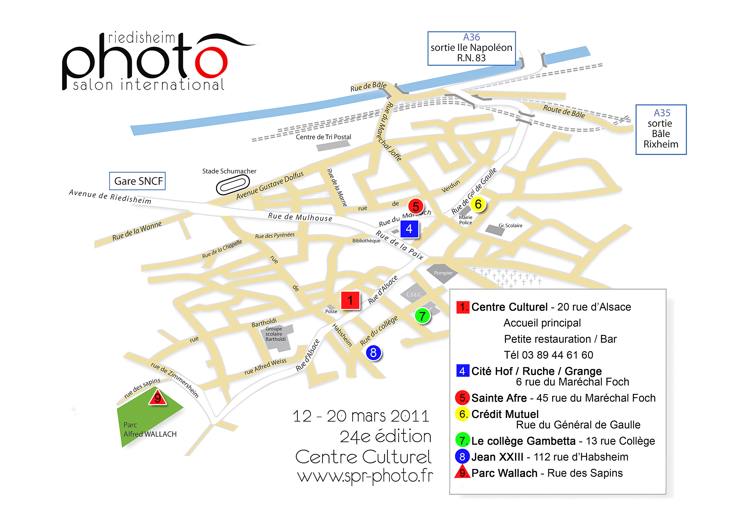 Le Salon International de la Photo de Riedisheim s'étend sur toute la ville. Les lieux principaux sont :
