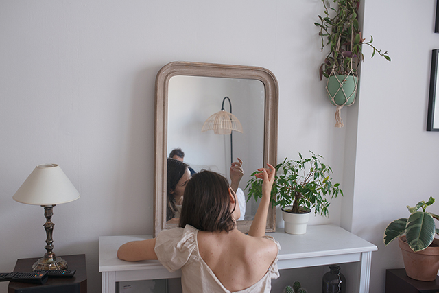 Pour assurer la cohérence visuelle, j’ai photographié le miroir en positionnant une plante sur ses bords ; il a par la suite été plus facile de dessiner une continuité entre la photo d’intérieur et celle d’extérieur, détourée et incrustée à la place du reflet. Plusieurs essais ont été nécessaires pour déterminer la photo de forêt idéale : il fallait non seulement que le rendu des branches soit satisfaisant, mais aussi que les éclairages des deux photos soient harmonieux.
