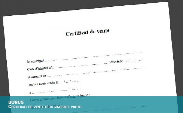 Téléchargez ici un certificat de vente type à utiliser lors d'un achat ou d'une vente d'un matériel photo d'occasion.
