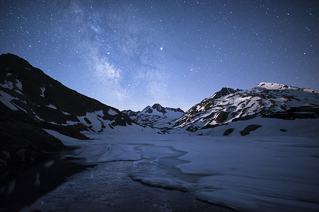Le début d’été est la période idéale pour photographier la Voie lactée qui est alors au plus haut sur l’horizon. Pour cela, il est impératif de se munir d’un objectif grand-angle lumineux (au moins f/2,8). Pour avoir des détails au premier plan, choisissez, comme ici, des zones enneigées ou bien un lac ou une rivière dans lequel les étoiles se reflèteront. Privilégiez une nuit sans lune ou, comme ici, juste un petit quartier de lune, dont la lumière vient éclairer le sommet à droite.