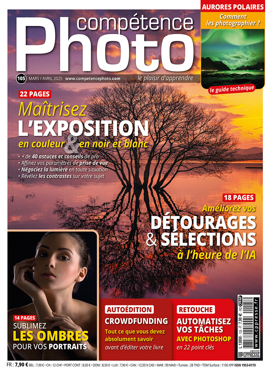 Le Numéro 105 de Compétence Photo se consacre à une problématique déterminante : la maîtrise de l’exposition, en distinguant la prise de vues en couleur et en noir et blanc, et quelles que soient les conditions de lumière (22 pages). Côté studio, découvrez un guide pratique sur la gestion précise des ombres pour réaliser de beaux portraits (14 pages). Et puisqu’il est de plus en plus fréquent de pouvoir les photographier en France, apprenez à capturer les aurores boréales grâce à un dossier complet (14 pages). Côté pratique logicielle, nous vous proposons un guide pas-à-pas pour améliorer vos détourages et sélections en post-traitement à l’heure de l’IA (18 pages). S’ajoute un article concernant l’automatisation des tâches pour gagner du temps en édition photo (16 pages). Également au sommaire de ce numéro : la rubrique Droit aborde tout ce que vous devez savoir sur le crowdfunding avant de lancer votre projet photo (livre, exposition). Enfin, découvrez un entretien exceptionnel avec le photographe Benoît Feron ainsi que notre sélection de boîtiers, objectifs, accessoires et livres. Bonne lecture !