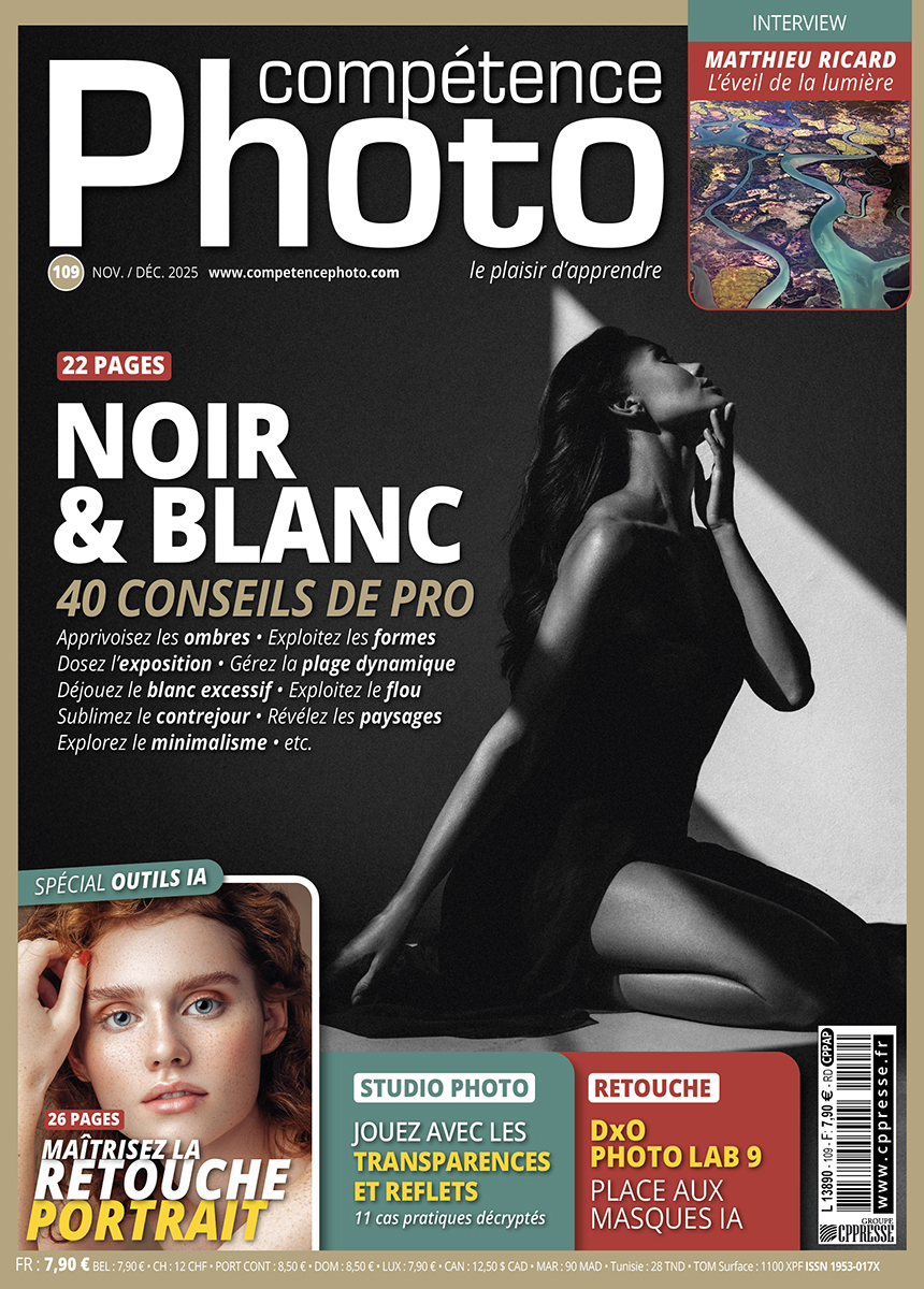 Le Numéro 109 de Compétence Photo fait la part belle à la photo noir et blanc pensée dès la prise de vue (22 pages). Ce copieux dossier vous livre pas moins de 40 astuces de pro pour comprendre l’image monochrome et élargir votre palette de créativité, que ce soit au niveau des rendus ou d’une atmosphère insoupçonnée. Suivez également nos conseils pour jouer avec les transparences et les reflets pour vos photos studio grâce à 11 cas pratiques pas-à-pas (14 pages). Côté édition logicielle, un grand dossier sur la retouche portrait vous accompagne pour exploiter les meilleurs outils dédiés à cette spécialité (26 pages). S’ajoute un guide pratique consacré au tout nouveau PhotoLab 9 de DxO, notamment avec l’ajout de masques IA (10 pages). Également au sommaire de ce numéro : un dossier pratique pour vous aider à préparer méthodiquement votre première exposition photo. La rubrique Droit répond ce mois-ci à la question : Peut-on modifier une photo dont on n’est pas l’auteur ? Enfin, lisez nos deux entretiens exceptionnels avec les photographes Matthieu Ricard et José Nicolas, ainsi que notre sélection d’objectifs, d’accessoires et de livres. Bonne lecture !
