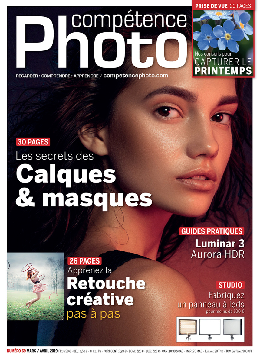 Le Numéro 69 de Compétence Photo vous propose de maîtriser trois éléments essentiels en correction et retouche d’images, à savoir les calques, les masques et les modes de fusion. Un grand dossier pratique de 30 pages destiné au débutant comme à l’amateur averti. Une fois ces connaissances acquises, vous aurez tout loisir de les exploiter, notamment en vous adonnant à la retouche créative, à laquelle ce numéro consacre son second grand dossier (26 pages). Il vous accompagnera pas à pas de la prise de vues à la retouche en passant par la combinaison des images brutes. Côté prise de vue, un troisième dossier vous livre de précieux conseils pour saisir les couleurs et lumières du printemps (20 pages). Côté traitement, deux solutions logicielles sont décryptées en détail et par l’exemple : le nouveau Luminar 3 et sa prometteuse Bibliothèque (8 pages), ainsi que Aurora HDR pour la réalisation d’images à grande gamme dynamique (8 pages). La photo de studio n’est pas oubliée : dans ce numéro, nous vous invitons à confectionner un large panneau à leds et son diffuseur intégré pour un budget n’excédant pas 100 € - il vous en coûterait le quintuple en optant pour un matériel neuf. Également au sommaire : la rubrique Droit aborde un sujet sensible, à savoir la publication d’images d’un enfant sur le web. La rubrique Photojournalisme interroge sur les spécificités et l’avenir du livre de photoreportage. Enfin, comme dans chaque numéro, la rubrique Livres présente une sélection d’ouvrages à offrir ou à vous offrir.